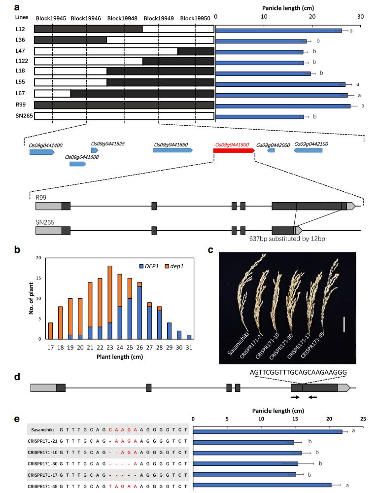 為了確定QTL簇的候選基因,進一步做了基因的精細定位。首先,關(guān)注的是chr9上的 qPL9簇,候選基因被定位在43kb的區(qū)間內(nèi),其中包含7個注釋基因,通過序列比對分析發(fā)現(xiàn)一個候選基因DEP1上的exon5中存在堿基序列的替換,即R99中637bp的片斷在SN265中被替換成12bp的序列;接著共分離分析發(fā)現(xiàn)SN265型的dep1具有明顯短于R99的穗長(圖5)。為了證明DEP1是qPL9的候選基因,利用 CRISPR/Cas9技術(shù)對Sasanishiki品種中的DEP1基因誘變,獲得五個突變體株系,其中四個突變體發(fā)生移碼突變,呈現(xiàn)短穗長,另外一個突變體產(chǎn)生兩個氨基酸的替換,其穗長與Sasanishiki無顯著性差異(圖5),暗示DEP1是qPL9簇中控制穗長的基因。