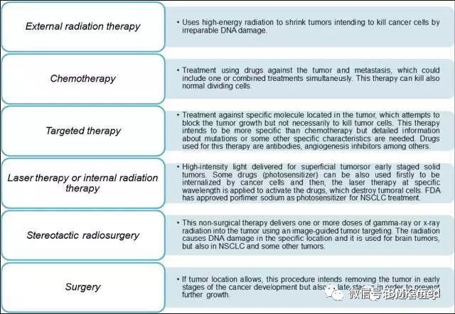 高強(qiáng)度射線照射表淺腫瘤或早期實(shí)體性腫瘤??墒紫葢?yīng)用某些藥物(如光敏劑),使其進(jìn)入腫瘤細(xì)胞后再應(yīng)用特定波長的微波進(jìn)行激光治療、?激活這些藥物從而破壞腫瘤細(xì)胞。FDA已批準(zhǔn)卟吩姆鈉(porfimer?sodium)用作NSCLC治療的光敏劑; - 立體定向放射手術(shù)