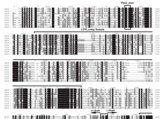 多重序列比對表明,硬骨魚和人的氨基酸高度保守。推導出的S.m-C4蛋白具有α-β連接子序列RXXR(在殘基668-671)和α-γ。連接序列RRXR(殘基1426-1429),其中C4氨基酸鏈被切割成三個鏈(α,β和γ鏈)。此外,保守的硫酯(GCGEQ)位點也定位在殘基1001至1005(圖5)。預測了TLR5由前21個氨基酸組成的信號肽和由14個氨基酸組成的跨膜螺旋。在膜結合型TLR5的LRR-CT中發(fā)現4個保守的半胱氨酸殘基,此外,還有9個蛋白結合區(qū)。結果表明,S.m-TLR5蛋白與銀大麻哈魚(91.5%)、大西洋鮭(91.7%)和衰白鮭(89.6%)的同源性較高,與鯉魚(48.1%)和金鯽(48.8%)的同源性較低。