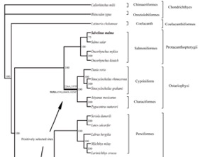 為了探究S.m-C4和S.m-TLR5免疫基因在魚類體內的系統發(fā)育情況,中國淡水花羔紅點鮭與另外23條硬骨魚、兩條鯊魚和一條腔棘魚用于C4基因研究。重建貝葉斯系統發(fā)育中,四種鮭魚形魚類組合在一起,具有較高的后驗概率(PP)(圖7)。同時三種鯉形目魚類和兩種鰓形目魚類分別用1.00 PP進行分組,形成骨鰾總目分支。這一結果與傳統分類學和系統發(fā)育相一致。硬骨魚分為鰓形目、原鰓形目、鰓形目和棘鰓目四支,其中,兩條鯊魚是外群。