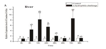 為探討這兩種免疫基因在細菌侵入的免疫應答,采用定量實時PCR(qPCR)技術,觀察注射后96h內肝、脾臟相關基因的表達。對于鹽水處理組,即對照組,S.m-C4基因在研究的所有時間點肝臟中均無顯著差異(圖9)。對于嗜水氣單胞菌注射組,即實驗組,肝臟在24小時有顯著增加(p=0.04),在12小時和72小時出現兩個峰值,邊緣顯著。在6h、12h、24h和72h,實驗組與對照組有顯著性差異。對照組脾臟中S.m-C4基因的相對表達上下波動,8個時間點之間差異不顯著,實驗組脾臟中S.m-C4基因的相對表達除72h外,其余時間點均無差異,與細菌注射組0 h相比減少59.6%。