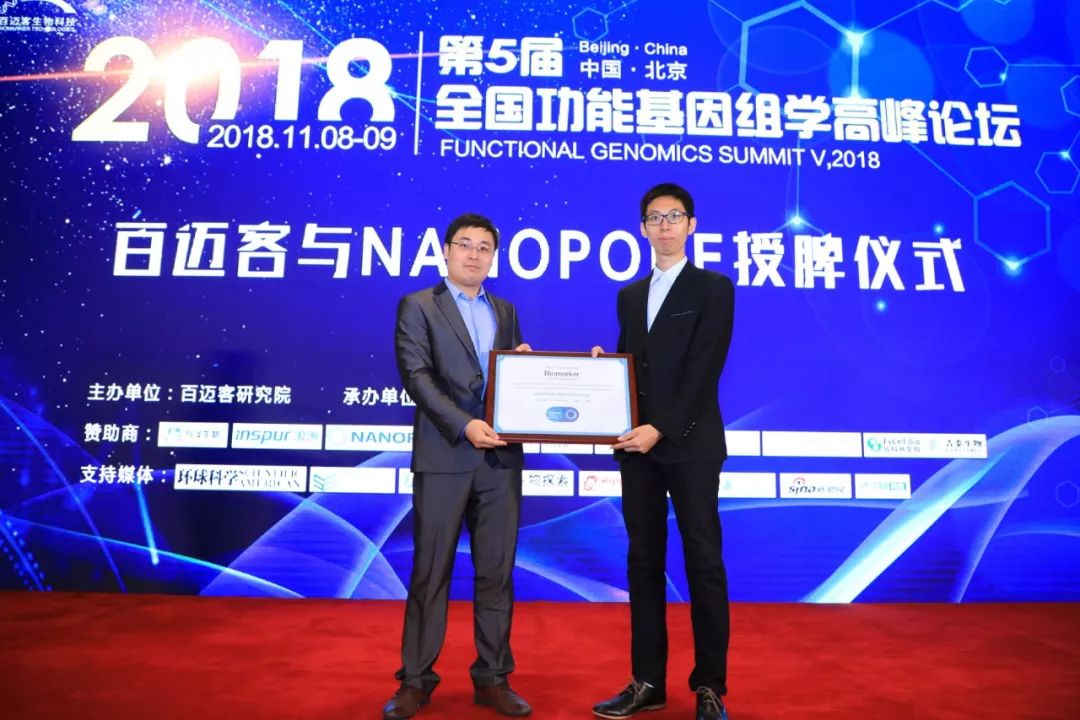 Nanopore官方人員預(yù)祝第五屆全國功能基因組學(xué)峰會圓滿成功,并確認(rèn)百邁客已拿到官方的DNA、RNA測序資質(zhì),這也是中國大陸拿到Nanopore RNA測序資質(zhì)的公司。同時百邁客也與Nanopore官方代表舉行授牌儀式。