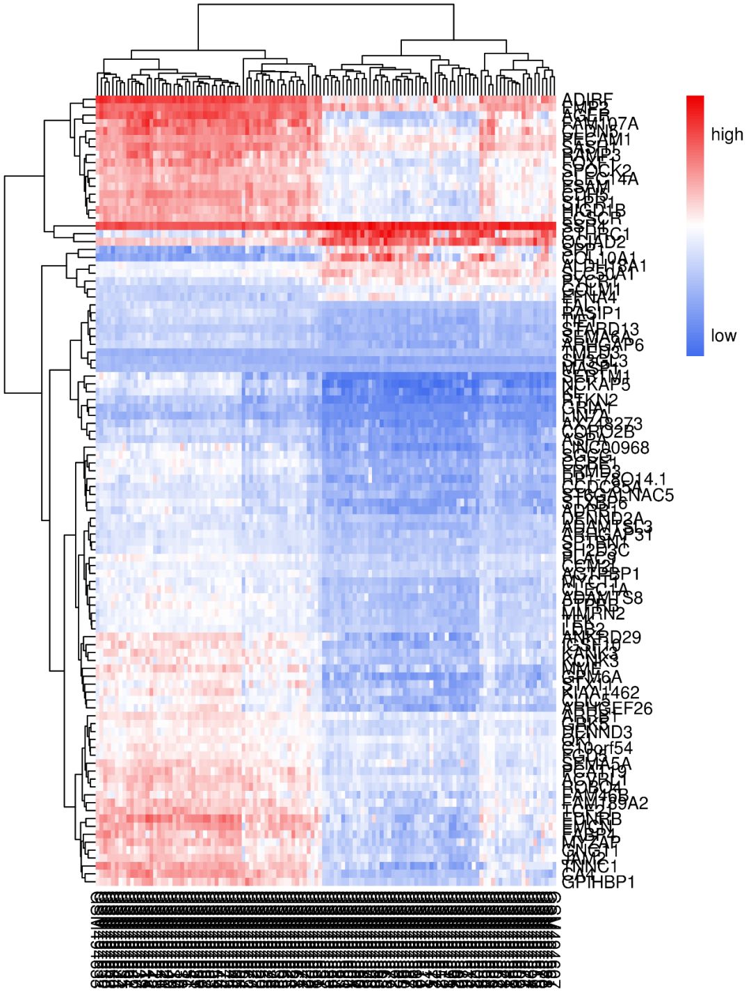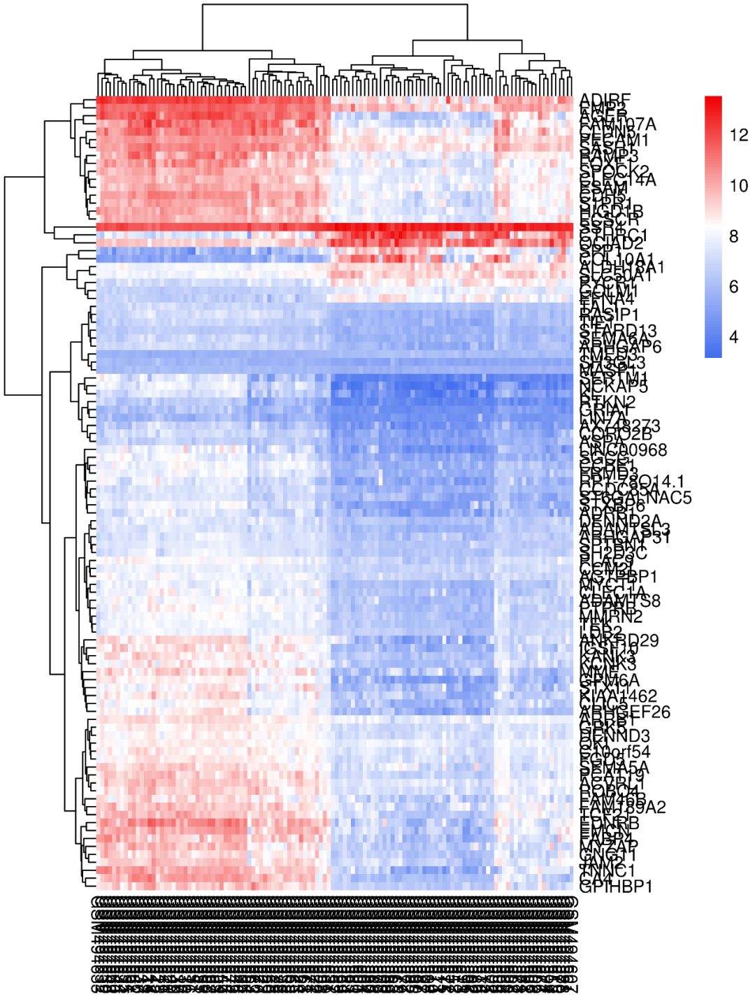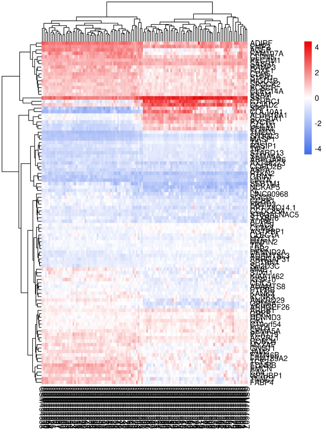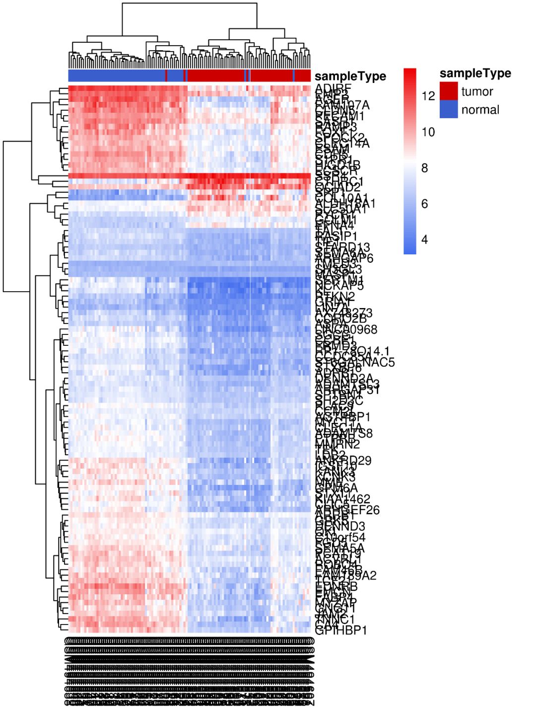 如使用默認(rèn)參數(shù)畫出來的熱圖,是不是很不好看?基因名和樣本名亂成一堆,也看不出來那些樣本聚類到了一起…這類熱圖怎么做?