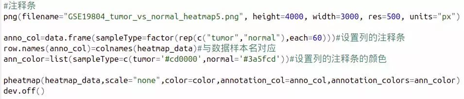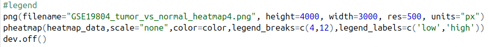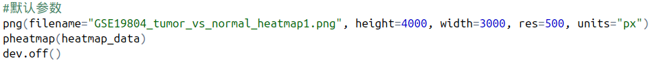我們修改了字體大小,不顯示樣本名,以及設(shè)置圖片標(biāo)題,到此時,經(jīng)過一系列參數(shù)更改,是不是已經(jīng)比一開始使用默認(rèn)參數(shù)好看多了呢?(可以增加一個對比圖,GSE19804_tumor_vs_normal_heatmap6.png與GSE19804_tumor_vs_normal_heatmap1.png的 對比)。