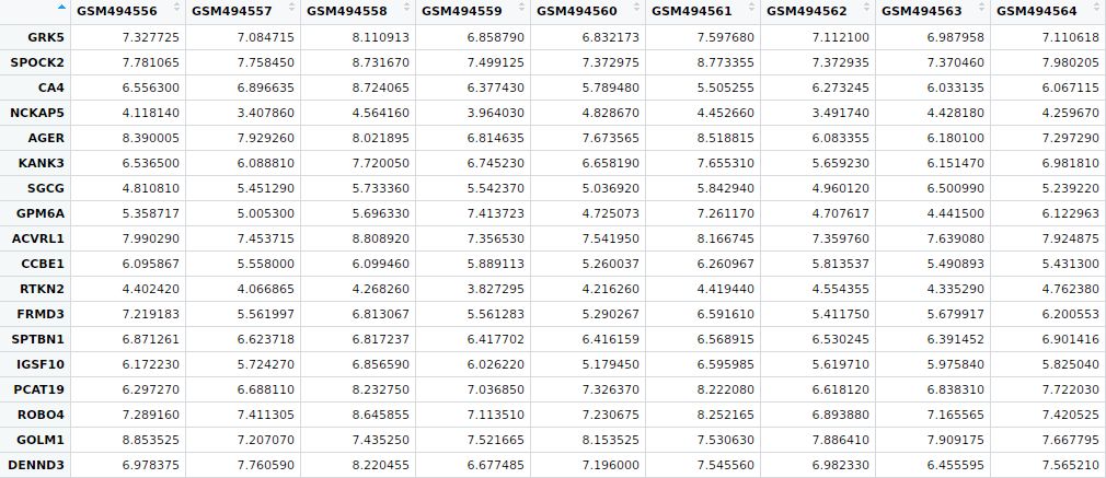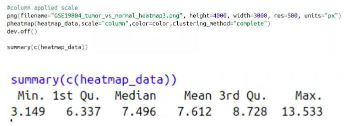 我們現(xiàn)在將數(shù)據(jù)進(jìn)行行均一化,聚類方法選擇complete,進(jìn)行均一化之后的熱圖還沒有前面的好看,查看數(shù)據(jù)表達(dá)情況,我們發(fā)現(xiàn)最小的表達(dá)值3.149和最大的表達(dá)值13.533之間并沒有相差很大,因此這套數(shù)據(jù)其實不適合做均一化處理,畫出來的熱圖更好看。
