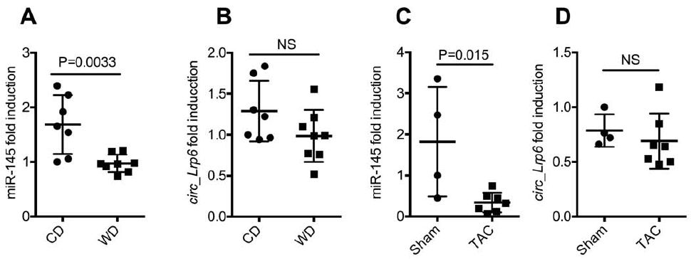 不同病理狀況circ_Lrp6和miR-145表達分析:例如動脈粥樣硬化血管患者中,miR-145的表達顯著降低,但circ_Lrp6沒有顯著變化,在復(fù)雜的病理學(xué)中兩個ncRNA在基因表達方面解離。