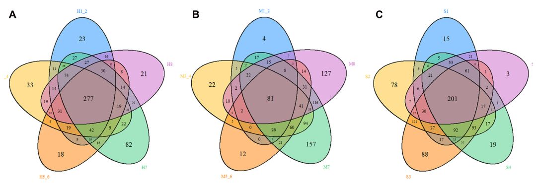 物種分類柱狀圖是表示HMD、MMD和SMD樣本中物種的組成及對(duì)應(yīng)物種在該樣本中的相對(duì)豐度。HMD、MMD和SMD樣本中在門水平和屬水平相對(duì)豐度前10的物種如圖5所示。無(wú)論是否存在腹瀉的樣本中,厚壁菌和擬桿菌都是主要的優(yōu)勢(shì)菌。然而,健康森林麝的糞便中厚壁菌的相對(duì)豐度明顯高于腹瀉麝。厚壁菌是構(gòu)成食物中纖維素分解代謝并將纖維素降解為宿主揮發(fā)性脂肪酸的主要細(xì)菌類型。此外,厚壁菌門還可以調(diào)節(jié)體內(nèi)免疫反應(yīng),抑制病原體的侵襲和預(yù)防腸道炎癥。腹瀉麝腸道中厚壁細(xì)胞豐度的減少可能會(huì)同時(shí)降低該物種的消化生理功能。另外,β多樣性的比較顯示,健康和腹瀉森林麝的細(xì)菌群落差異極顯著,這與麝的異常消化生理功能有關(guān)。HMD、MMD和SMD三組不同樣本之間共有OTU和特有OTU數(shù)量如圖6所示。