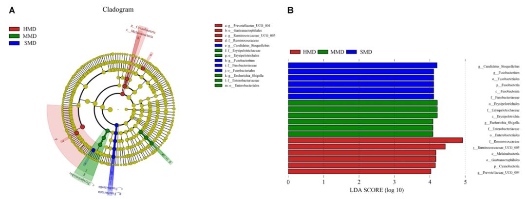 LefSe分析表明(圖7),在屬的水平上,MMD組與HMD和SMD組之間顯著性差異較大的菌種為埃希氏菌?–?志賀氏菌。埃希氏菌屬?–?志賀氏菌是常見的病原體,其主要的傳播途徑包括:受感染對(duì)象的糞便、食物和含有細(xì)菌的水。該病原體可引起結(jié)腸粘膜炎癥,導(dǎo)致腹痛、腹瀉和形成粘膜糞便等癥狀。因此,用于喂養(yǎng)麝的食物和水以及糞便管理是減輕輕度腹瀉的關(guān)鍵。另外,SMD組與HMD和MMD組之間顯著性差異較大的菌種為梭桿菌。梭桿菌是炎癥性微生物,它可抑制體內(nèi)T細(xì)胞應(yīng)答并促進(jìn)炎性因子的表達(dá)。比較MMD組和SMD組,可以推測(cè)Fusobacterium可能在輕度腹瀉的背景下增殖并成為主要病原體。因此,森林麝的腸道生理紊亂與其主要病原體的類型是存在一定的相關(guān)性的。