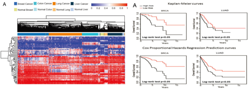 從TCGA中常見癌癥(肺癌、乳腺癌、結(jié)腸癌、肝癌)的甲基化數(shù)據(jù)中篩選癌癥標(biāo)記物,這些標(biāo)記物能非常準(zhǔn)確的(準(zhǔn)確度95%)區(qū)分開癌組織和正常組織。同時(shí)他們發(fā)現(xiàn)DNA甲基化模式可以預(yù)測預(yù)后和生存。