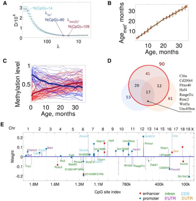 該研究對不同年齡階段的小鼠進(jìn)行RRBS研究,并找到了90個與年齡相關(guān)的CpG位點(diǎn)來構(gòu)建小鼠生物學(xué)年齡的預(yù)測器。這些位點(diǎn)的clock代表了衰老的生物標(biāo)志物,并可以用來確定生物體的生物學(xué)年齡,并進(jìn)一步干預(yù)衰老的速度。
