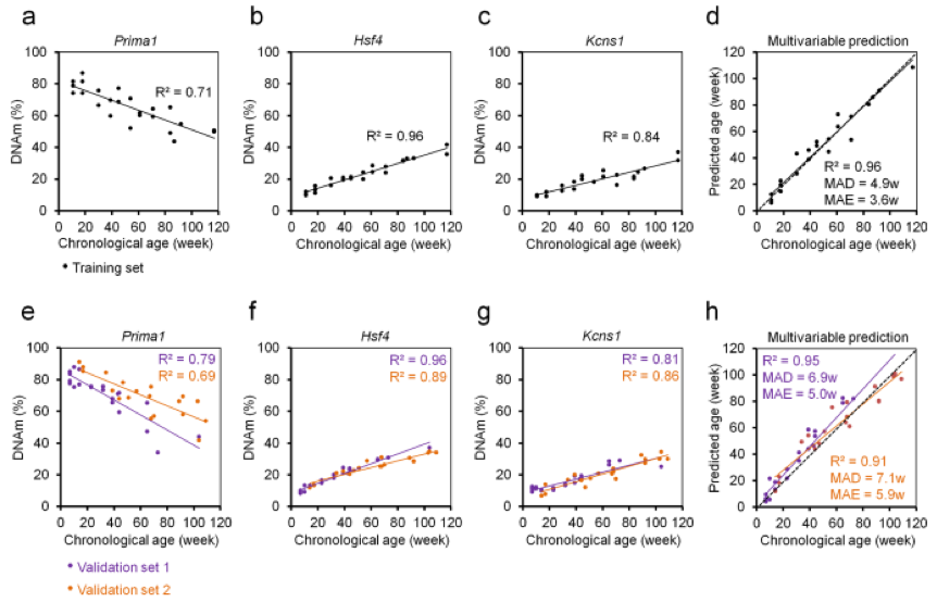 該研究從上述研究及其他研究中的基礎(chǔ)上選擇了9個甲基化區(qū)域在不同年齡段的小鼠血液樣品中進(jìn)行焦磷酸測序,建立年齡預(yù)測的模型,最后選擇了3個CpG位點(diǎn)(Prima 1, Hsf4, Kcns 1)來預(yù)測小鼠的年齡和壽命。
