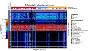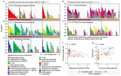 基于線性模型分析IBD微生物組的酶功能(EM)。與對(duì)照組相比,568種酶的豐度在UC或CD患者中差異顯著(FDR,q<0.05)(圖8.),其中246種酶不受任何單一菌種支配。UC和CD患者均富集有鎂離子轉(zhuǎn)運(yùn)ATP酶(EC 3.6.3.2)(圖9.a)和乙醇胺氨裂合酶(EC 4.3.1.7)(相對(duì)于對(duì)照組)(圖9.b),而乙醇胺氨裂合酶與甘油磷脂的合成有關(guān),后者在UC和CD患者的代謝物中富集最多(圖3.a)。谷胱甘肽還原酶(EC 1.8.1.7)在IBD患者中也有較高豐度(圖9.c);丙酮酸合成酶(EC 1.2.7.1)在對(duì)照組中富集,在CD患者中完全未檢測到(圖9.d);維生素B12(如前咕啉,EC 1.3.1.76)在對(duì)照組含量較高(圖9.e)。四吡咯可能是維生素B12的衍生物和相關(guān)化合物,它在LC-MS代謝組分析中普遍存在,并且在IBD患者中富集(圖4.b)。