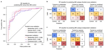 最后,本研究從代謝物、微生物菌“種”及兩者組合水平訓(xùn)練“隨機(jī)森林”(RF)分類器,鑒定IBD病癥和IBD子集,受試者工作曲線(ROC)描繪RF分類器的假陽性率和準(zhǔn)確率,混合矩陣評(píng)估PRISM隊(duì)列IBD子集RF分類器。結(jié)果顯示,所有RF分類器對(duì)IBD患者和健康人群的辨識(shí)效果良好,AUC值為0.86-0.92,交叉驗(yàn)證結(jié)果(AUC:0.90-0.92)更優(yōu)于獨(dú)立驗(yàn)證結(jié)果(AUC:0.86-0.89)(圖10.a)。PRISM隊(duì)列中,代謝物、微生物菌“種”及兩者組合水平預(yù)測UC、CD和健康人群的準(zhǔn)確率為64-65%,該結(jié)果雖然不如案例/對(duì)照成功,但仍高于隨機(jī)預(yù)測(正確率:30%)(圖10.b),將PRISM訓(xùn)練IBD子集RF分類器應(yīng)用于荷蘭人群時(shí)(用于人類疾病驗(yàn)證),輸入數(shù)據(jù)類型之間差異較大(圖10.b)。