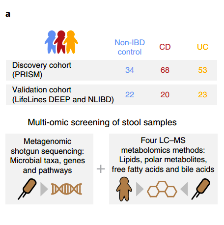 1.? 樣本收集(糞便):①PRISM(麻省總院IBD前瞻注冊試驗(yàn)):CD患者(68例),UC患者(53例),健康人群組(34例)(Fig. 1a);②LifeLines DEEP和NLIBD(荷蘭北部人群前瞻研究,用于人群疾病的驗(yàn)證):CD患者(20例),UC患者(23例),荷蘭北部健康人群(22例)(圖1.a)。