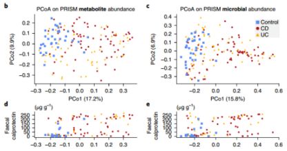 本研究從155例(PRISM)樣本中共檢測出8,000多種代謝物,這些代謝物在健康人群與CD患者之間差異較大,UC患者的代謝物與健康人群和CD患者均有一定程度相似(圖1.b)。糞便樣品中的鈣保護(hù)素與代謝物、菌群結(jié)構(gòu)變化的第一主軸(PCoA)相關(guān)性均較強(qiáng)(圖1.d.1e),UC患者的炎癥程度既與健康人群相似又與CD患者相似,表明UC患者之間的腸道菌群結(jié)構(gòu)與代謝組份差異較大。