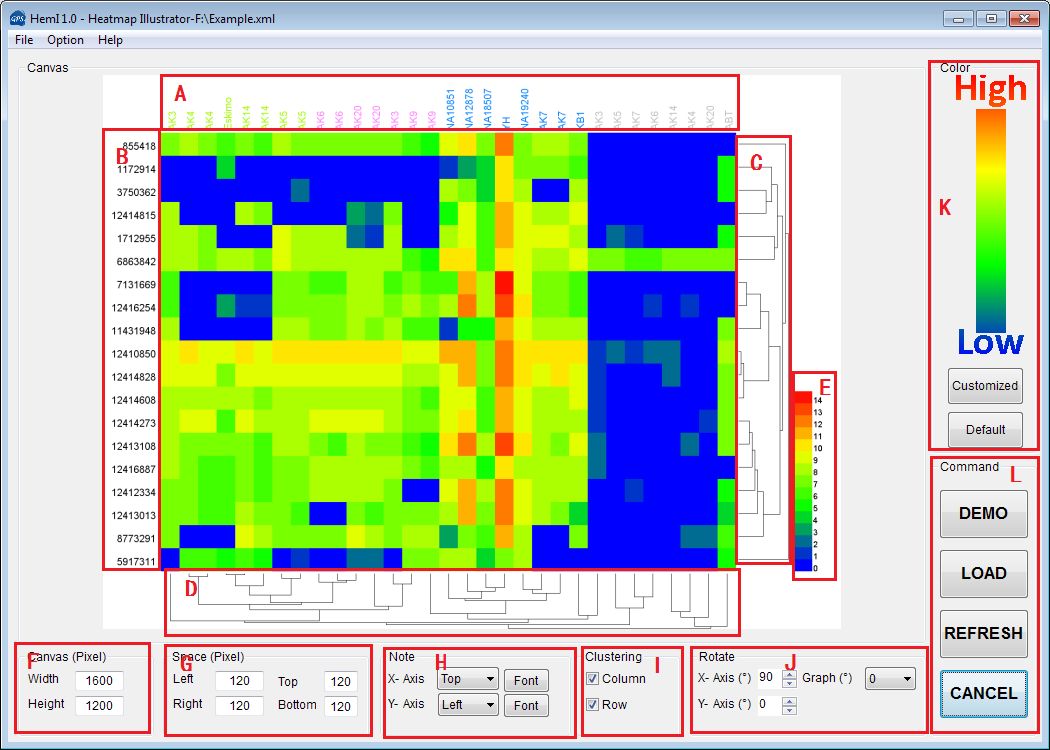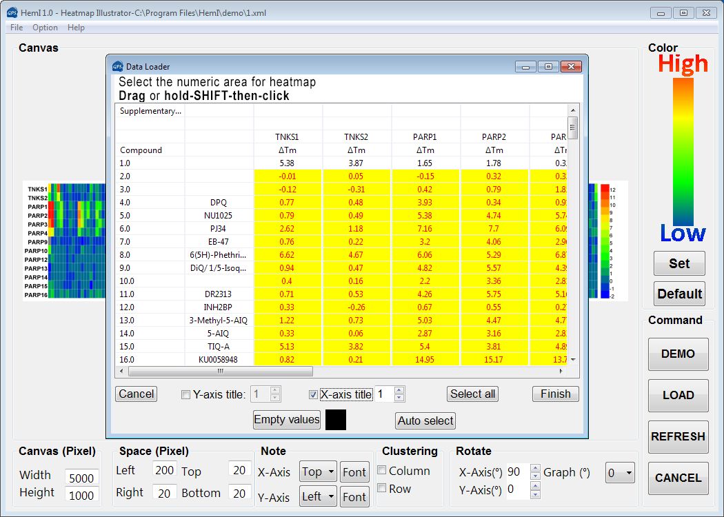 點擊L框中的LOAD按鈕即可打開要生成heatmap的文件,excel格式也可以。X-axis title是選擇橫軸坐標對應到輸入文件的哪一行,選擇auto select自動選擇矩陣數(shù)據(jù)。