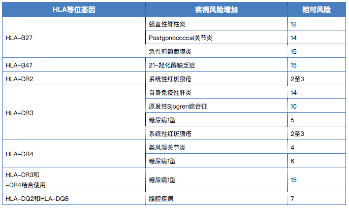 1972年Russel報(bào)告銀屑?。ㄅFぐ_)患者攜帶HLA-B13或HLA-B17。此后陸續(xù)發(fā)現(xiàn)大量其它疾病與特定的HLA相關(guān),其中,HLA-B27抗原見(jiàn)于大約90%的強(qiáng)直性脊椎炎病人,由此HLA-B27在臨床檢測(cè)中作為強(qiáng)直性脊柱炎的標(biāo)志物,以至使HLA分型具有了診斷價(jià)值,甚至,能較早地證實(shí)疾病亞型之間的臨床區(qū)別,例如,尋常銀屑病與HLA相關(guān),而膿皰性銀屑病則不然;青少年性胰島素依賴(lài)型糖尿病與HLA-B8、HLA-Bw15和HLA-B18相關(guān),而晚期發(fā)作型糖尿病并無(wú)這種相關(guān)性。因此,特定類(lèi)型的HLA便成為某些疾病的遺傳標(biāo)志。在疾病研究的延伸面,是關(guān)于HLA與長(zhǎng)壽的關(guān)系,目前亦形成一個(gè)新的研究熱點(diǎn)。目前研究比較清楚的幾個(gè)HLA與自身免疫疾病相關(guān)關(guān)系如下表: