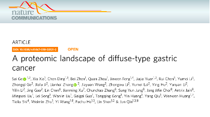 胃癌(GC)在全球腫瘤死亡原因中排名第三,我國(guó)是胃癌發(fā)病和死亡的重災(zāi)區(qū)。Lauren分型從形態(tài)學(xué)上將GC分為三種類型:彌散型,腸型和混合型,彌漫型胃癌(DGC)占GC的約30%,預(yù)后最差,且缺少有效的靶向治療手段。盡管國(guó)際上發(fā)表過(guò)基于基因組和轉(zhuǎn)錄組的胃癌分子分型,但均沒(méi)有與臨床預(yù)后實(shí)現(xiàn)有效的關(guān)聯(lián)性。本文對(duì)胃癌組織及其附近組織進(jìn)行蛋白質(zhì)組學(xué)研究,是DGC的蛋白質(zhì)組學(xué)分析,研究成果發(fā)表在Nature Communications雜志上。