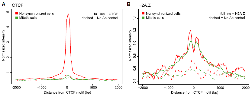 綜上,在前中期期間CTCF與CTCF位點(diǎn)結(jié)合的喪失以及CTCF基序周?chē)娜旧|(zhì)重排,并且cohesin喪失,將導(dǎo)致在有絲分裂期間觀察到的TAD和CTCF環(huán)的喪失,并揭示CTCF位點(diǎn)、關(guān)鍵的結(jié)構(gòu)順式元件以及在蛋白因子結(jié)合和核小體定位中顯示細(xì)胞周期階段依賴性動(dòng)力學(xué)。