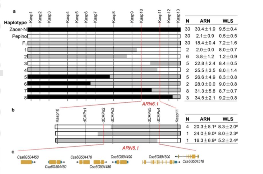 本研究利用SLAF-BSA技術,將黃瓜耐澇基因定位在301kb區(qū)間內(初定位群體為949株,選擇50+50的混池),針對定位區(qū)間的SLAF標簽的SNP信息設計KASP標記和dCAPS標記,并對6691個F2子代和6個F2:3家系進行分型,結合重組個體基因分型和表型數(shù)據,將ARN6.1定位在36.1kb的范圍內,后期結合轉錄組,找出候選基因CsARN6.1。