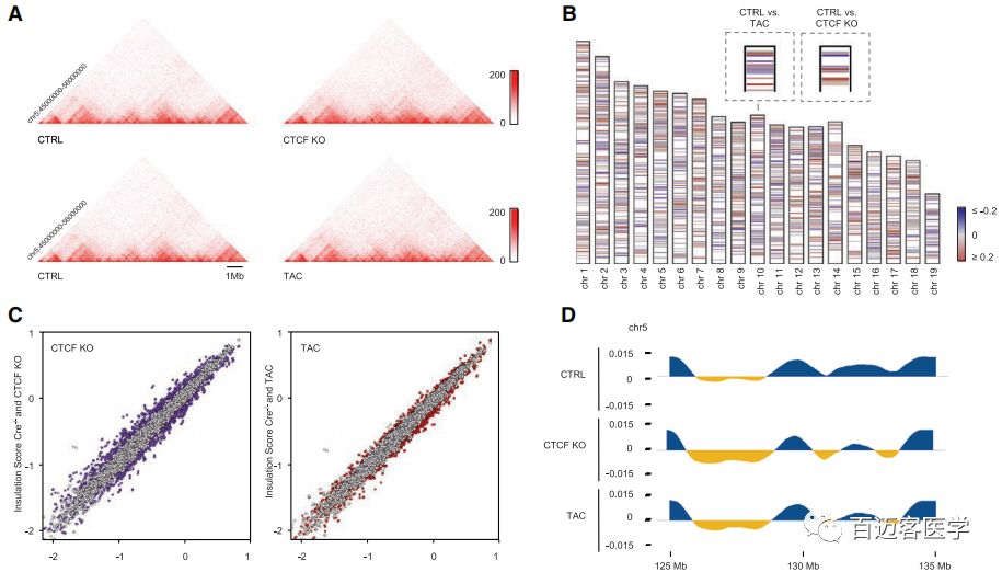 正常對照成年小鼠(CTRL)和兩個不同的疾病模型(TAC、CTCF-KO)小鼠的Hi-C結(jié)果揭示了5 kb分辨率下心肌細胞的基因組相互作用,得到了染色體內(nèi)和染色體間的互作事件,并為未來的心臟表觀基因組研究提供了依據(jù)。壓力超載或CTCF缺失選擇性地改變了TAD的邊界強度和A/B?compartment、基因組可及性。心力衰竭涉及致病基因周圍染色質(zhì)互作穩(wěn)定性的降低。此外,壓力超負荷或CTCF缺失重塑了心臟增強子的長距離互作,導致這些功能元件周圍局部染色質(zhì)互作顯著減少。