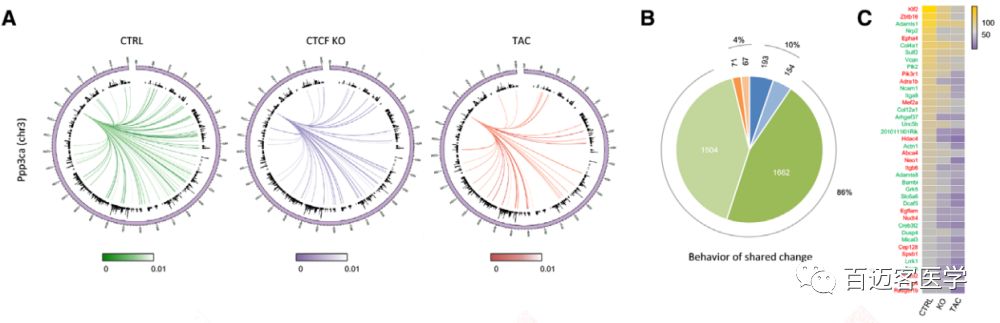 存在互作的9194個表達基因中,60%的基因在CTCF-KO和TAC中的互作變化方向相同。而剩余的40%基因中大多數(shù)(75%)是在某一組疾病細胞中虎作沒有發(fā)生變化的,25%是互作變化在兩組中相反的。在CTCF-KO和TAC中互作改變相同且差異表達的3651個基因中,絕大多數(shù)(86%)的局部互作減少(圖4B)。這些發(fā)現(xiàn)支持了這樣一種趨勢,即更多的動態(tài)染色質(zhì)互作影響基因表達,兩組疾病細胞與對照相比,它們的基因表達變化方向更可能趨向一致。互作數(shù)量top 40的差異表達基因在疾病細胞中的互作持續(xù)下降,如與鈣依賴信號和心肌肥厚相關(guān)的基因Ppp3ca。