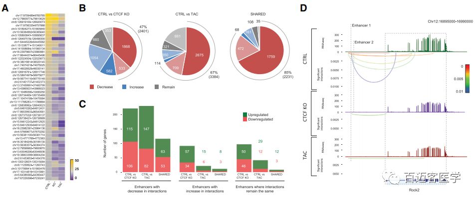 在先前鑒定的成人心肌細胞增強子中,其中有115050個再本研究中存在互作。這些增強子的互作在疾病細胞中減少。事實上,其中47%在CTCF-KO中表現(xiàn)出了互作減少,67%在TAC中表現(xiàn)出互作減少。兩種疾病細胞中共有的增強子中,85%在兩者中均出現(xiàn)互作減少。且兩種疾病細胞中基因表達變化與其增強子-基因互作的減弱有關(guān),且受影響的基因在心臟病理通路中富集,如Rock2。
