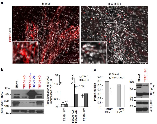TEAD1KO異種移植樣本中EGFR的表達(dá)水平低于對(duì)照樣本,且TEAD1KO細(xì)胞系中EGFR表達(dá)相比于正常對(duì)照細(xì)胞系顯著下調(diào),TEAD1過(guò)表達(dá)后EGFR表達(dá)有回升。對(duì)EGFR下游信號(hào)元件的表達(dá)水平的檢測(cè)發(fā)現(xiàn),pERK在TEAD1KO細(xì)胞中下調(diào),而pAKT則不同。TEAD1KO細(xì)胞經(jīng)過(guò)較長(zhǎng)時(shí)間的培養(yǎng)后,EGFR表達(dá)恢復(fù),而遷移仍受影響。因此,TEAD1直接且短暫地調(diào)控EGFR。