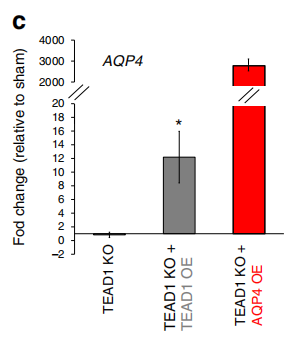 作者通過(guò)ATAC-seq和轉(zhuǎn)錄組測(cè)序數(shù)據(jù)篩選出來(lái)TEAD1的候選靶基因,并進(jìn)一步利用ChIP-PCR,驗(yàn)證了與TEAD1結(jié)合的靶基因–AQP4、EGFR和CDH4。TEAD1敲除使AQP4下調(diào),TEAD1過(guò)表達(dá)可恢復(fù)AQP4的表達(dá),而TEAD1和AQP4過(guò)表達(dá)均可修復(fù)TEAD1KO細(xì)胞的遷移缺陷,說(shuō)明TEAD1作用于靶基因AQP4,調(diào)控其表達(dá),進(jìn)而參與GBM遷移的直接調(diào)控機(jī)制。