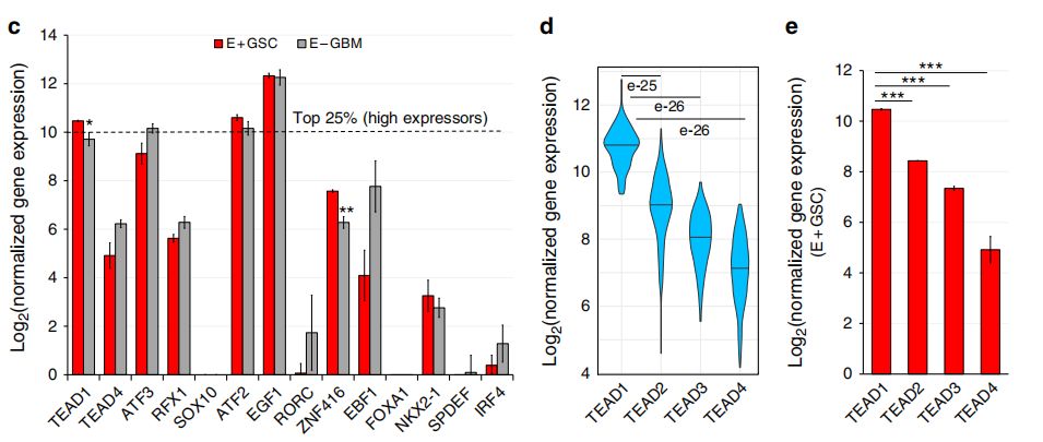 通過(guò)ATAC-seq分析染色質(zhì)的可及性,不僅可以識(shí)別轉(zhuǎn)錄的調(diào)控區(qū)域,還可以推斷出其中的TF活性。在此,作者鑒定了27個(gè)GSC腫瘤特異性的TF motif,26個(gè)在E+GSC和E+NSPC中共有的發(fā)育相關(guān)TF motif。其中,TEAD1/4是具有很高活性的TF( motif是GSC特有peak中顯著富集,且基因表達(dá)水平高),其它候選TF包括ATF3、RFX1、FOXA1等。而E+GSC和E+NSPC中共有的發(fā)育相關(guān)TF包括SOX1、IRF3、NFIA等。然后,作者利用以前的類似的E+/E-GBM的RNA-seq數(shù)據(jù),考慮到腫瘤特異性TF的基因表達(dá)水平,其中只有TEAD1在E+GSC中差異過(guò)表達(dá)。