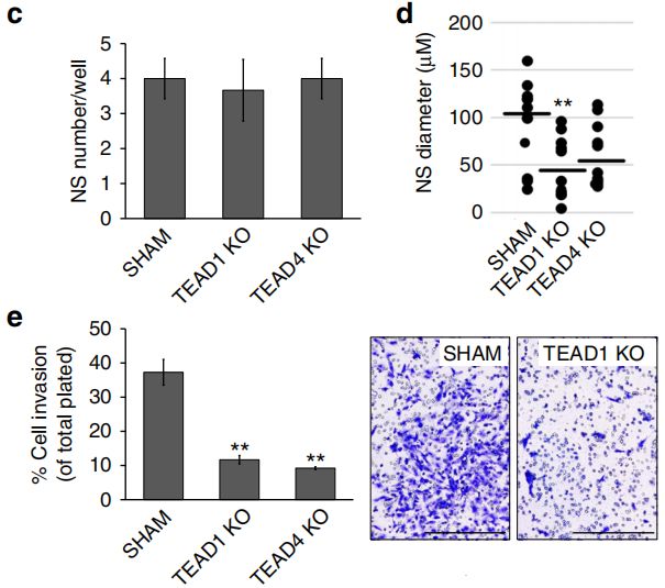 作者通過(guò)ATAC-seq繪制了膠質(zhì)母細(xì)胞瘤干細(xì)胞(GSC)和神經(jīng)干細(xì)胞(NSPC)的全基因組染色質(zhì)開放區(qū)域圖譜,并結(jié)合轉(zhuǎn)錄組測(cè)序數(shù)據(jù)發(fā)現(xiàn)了在腫瘤細(xì)胞遷移中起關(guān)鍵作用的轉(zhuǎn)錄因子TEAD1,并通過(guò)細(xì)胞和異種移植模型水平上的TEAD1的敲除與過(guò)表達(dá)的體內(nèi)外功能驗(yàn)證實(shí)驗(yàn),驗(yàn)證了TEAD1促進(jìn)遷移的功能性作用。