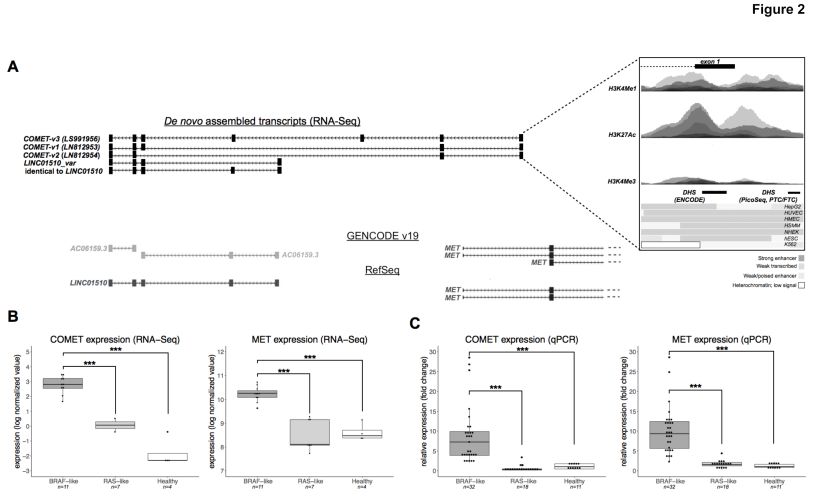 為了探索PTC中BRAF和RAS樣特異性lncRNA模式,首先在最近發(fā)表的來自22個甲狀腺活組織的RNA-Seq數(shù)據(jù)集中建立了從頭轉(zhuǎn)錄組裝的計算工作流程,定義一個新的PTC模型轉(zhuǎn)錄組。大于200nt低編碼潛能且與已注釋基因位點無重疊的轉(zhuǎn)錄本鑒定出454個新的lncRNA。與蛋白質(zhì)編碼基因類似,已知和新發(fā)現(xiàn)的lncRNA在患者和對照之間具有顯著差異的表達(dá)水平(FDR <0.05)。202個lncRNAs的表達(dá)在BRAF和RAS樣PTC之間存在顯著差異(其中77個在BRAF樣PTC中過表達(dá),125個低表達(dá)),其中60個未在公共數(shù)據(jù)庫中注釋(圖1D和1E;FDR <0.05)。因此,為鑒定尚未注釋的lncRNAs :i)在PTC中異常表達(dá),ii)在BRAF-和RAS樣亞組之間差異表達(dá),iii)在附近定位和iv)與已知癌癥驅(qū)動基因高度相關(guān),作者使用“最近轉(zhuǎn)錄起始位點”(TSS)方法選擇mRNAs / lncRNAs對。有趣的是,基于這些標(biāo)準(zhǔn),將COMET(COrrelated-to-MET)鑒定為新的lncRNA,與MET癌基因正相關(guān)(r = 0.7)。