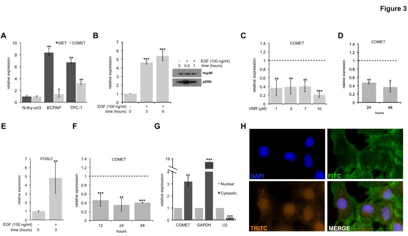 BRAF樣PTC的特征在于ERK介導(dǎo)的轉(zhuǎn)錄程序的過度激活。這一點促使研究COMET表達(dá)是否在MAPK激活下游被誘導(dǎo)。因此,用表皮生長因子(EGF)刺激Nthy-ori 3-1細(xì)胞中的RAS-RAF-MEK-ERK途徑。MAPK途徑的誘導(dǎo) – 通過早期p-Erk增加證實(圖3B,右圖) – 隨后COMET水平顯著增加(圖3B,左圖)。相反,使用化學(xué)和遺傳方法抑制BRAF突變的BCPAP細(xì)胞系中的組成型活性途徑,通過用vemurafenib阻斷過度活化的B-Raf蛋白(圖3C)或BRAF基因KD(圖3D),顯著降低COMET水平。之后評估了COMET細(xì)胞定位,與qPCR偶聯(lián)的RNA分級分析顯示,與內(nèi)參蛋白質(zhì)編碼基因(GAPDH)類似,COMET在細(xì)胞質(zhì)RNA部分中具有明顯富集(圖3G)。此外,RNA FISH進(jìn)一步證實了這種新的NAT lncRNA的細(xì)胞質(zhì)定位(圖3H)。