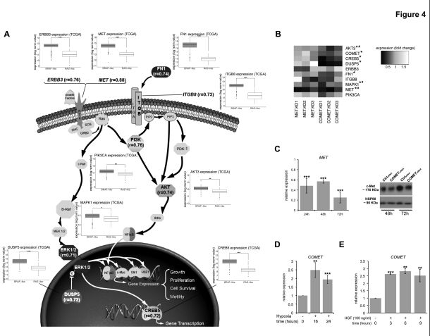 為了預(yù)測COMET的功能并確定其在乳頭狀甲狀腺癌中的潛在生物學(xué)意義,基于共犯原則進(jìn)行分析。利用基于TCGA的lncRNA圖譜TANRIC,使用Pearson相關(guān)性評估甲狀腺癌樣本中的COMET表達(dá)是否與其他基因的表達(dá)相關(guān)。與初步發(fā)現(xiàn)一致,用鄰近癌基因MET檢測出最高相關(guān)值(r = 0.88)。此外,對與COMET顯著相關(guān)(FDR <0.05;r≥0.7)的基因進(jìn)行的通路分析顯示MAPK通路的富集,并且有趣的是,其中一些在來自TCGA的PTC樣品的BRAF樣群中過表達(dá)( 圖4A)。