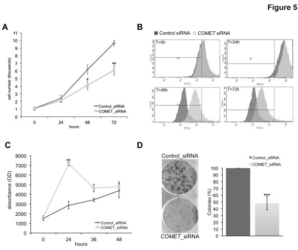 為了驗證COMET表達(dá)作為Ret和B-Raf蛋白組成型激活的下游轉(zhuǎn)錄事件,檢測了攜帶BRAFV600E突變(BCPAP)或RET基因重排(TPC-1)的PTC細(xì)胞系中的COMET水平與永生化正常甲狀腺細(xì)胞系(Nthy-ori 3-1)的比較 。正如所料,COMET以及MET在BRAF樣細(xì)胞系中的表達(dá)顯著高于正常細(xì)胞(圖3A); 顯示最高COMET表達(dá)水平的TPC-1細(xì)胞系用作下一步大多數(shù)表型測定的體外模型。