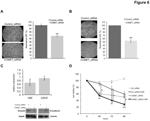 據(jù)報道,受體酪氨酸激酶(RTK),特別是c-Met受體的激活是腫瘤細(xì)胞逃避vemurafenib(VMR,維莫非尼)介導(dǎo)的突變體B-Raf蛋白抑制的機(jī)制。由于作者數(shù)據(jù)支持COMET可作為MET新的調(diào)節(jié)劑,猜測它是否也可能作用于BRAF突變的腫瘤細(xì)胞中的vemurafenib反應(yīng)機(jī)制。首先,與TPC-1細(xì)胞類似,評估COMET沉默對BRAFV600E突變的BCPAP細(xì)胞系的生存力(高達(dá)50%)具有強(qiáng)烈影響(圖6D),伴隨MET水平的下降。當(dāng)用VMR處理BCPAP時,也表現(xiàn)出了類似的效果(高達(dá)60%的細(xì)胞存活率降低)。因此,將敲低COMET的BCPAP細(xì)胞暴露于VMR,以評估組合治療是否可發(fā)揮累加效應(yīng)。有趣的是,圖6D中數(shù)據(jù)表明,與對照細(xì)胞(即僅用VMR處理和/或用對照siRNA轉(zhuǎn)染的細(xì)胞,圖6D)相比,COMET敲低的 BCPAP細(xì)胞具有顯著增強(qiáng)的VMR敏感性,表明在BRAFV600E突變腫瘤中COMET是提高化療的新靶標(biāo)。