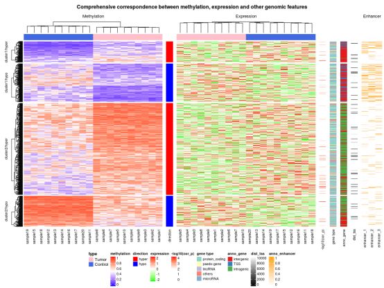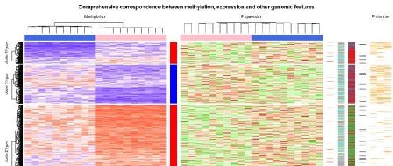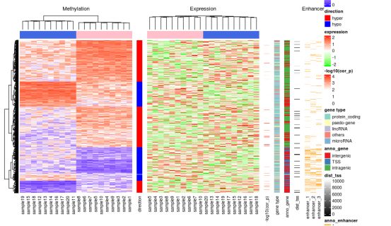本次,我們將展示一個(gè)甲基化與表達(dá)譜聯(lián)合分析的熱圖。本著先學(xué)習(xí)再創(chuàng)造的態(tài)度,小編做了一下知識的搬運(yùn)工,本篇所有代碼均引用自:Zuguang Gu, Roland Eils and Matthias Schlesner,?Complex heatmaps reveal patterns and correlations in multidimensional genomic data,?Bioinformatics, 2016。