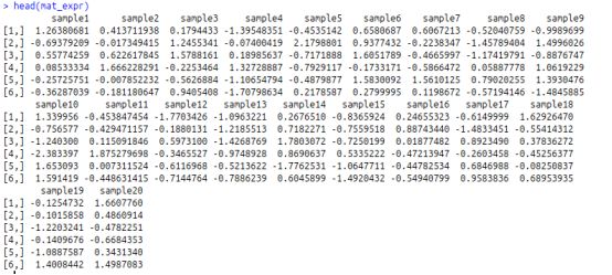 #矩陣,其中行對應(yīng)于與DMR相關(guān)的基因(即與DMR最近的基因,也可以叫做DMR關(guān)聯(lián)基因),矩陣中的值是每個(gè)樣品中每個(gè)基因的表達(dá)水平(對樣品中的每個(gè)基因的表達(dá)進(jìn)行了標(biāo)準(zhǔn)化)。