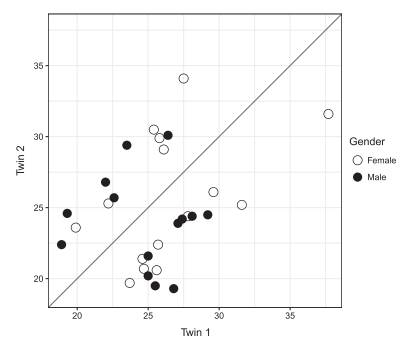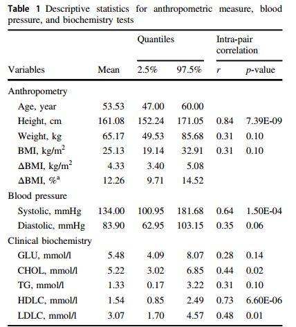 表1展示了樣本相關(guān)人體測(cè)量和生化變量的結(jié)果。最后一列是每個(gè)變量的對(duì)內(nèi)相關(guān)性。大多數(shù)變量具有相當(dāng)高的和/或顯著相關(guān)性,一些顯示低或不顯著的對(duì)內(nèi)相關(guān)性(例如GLU,TG)。下圖顯示了每對(duì)雙胞胎的BMI測(cè)量值。所有雙胞胎都與對(duì)角線(xiàn)保持距離,表明BMI測(cè)量中的對(duì)內(nèi)不一致。同時(shí),圖中的總體模式還表明如表1中報(bào)告的BMI的弱配對(duì)內(nèi)相關(guān)性(r = 0.307,p = 0.099)。在男性(實(shí)點(diǎn))和女性(空點(diǎn))雙胞胎中沒(méi)有觀察到BMI不一致的性別特異性模式。