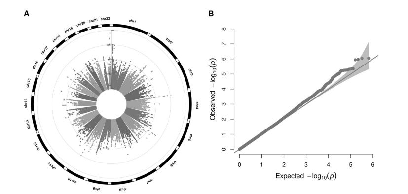 基于單個(gè)位點(diǎn)的EWAS分析,鑒定出136個(gè)CpG(p <1e-04),其中30個(gè)CpG(p <1e-05),2個(gè)CpG(p <1e-06)。 沒(méi)有位點(diǎn)達(dá)到全基因組顯著性(定義為FDR <0.05),最低FDR = 0.195。 圖中顯示了每個(gè)CpG位點(diǎn)的p值與其染色體位置的曼哈頓圖(圖a)和針對(duì)隨機(jī)預(yù)期p值分布繪制的預(yù)估p值的Q-Q圖(圖b)。最顯著CpG?p值表明與隨機(jī)分布的偏差及其陰影區(qū)域的95%置信區(qū)間(圖b),說(shuō)明這些CpG與BMI的非隨機(jī)關(guān)聯(lián)。