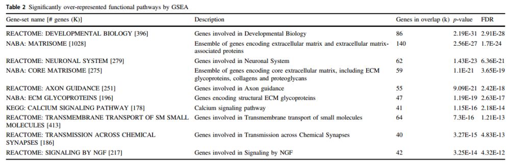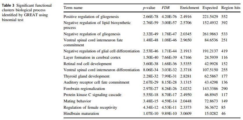 采用biomaRt,38487個(gè)CpG中(P<0.05),23,863個(gè)CpG注釋到2542個(gè)功能基因,基于GSEA在BioCarta 基因集, KEGG 基因集和Reactome基因集富集分析。富集通路相關(guān)基因包括參與編碼細(xì)胞外基質(zhì)(ECM)相關(guān)蛋白,包括ECM糖蛋白、膠原蛋白和蛋白多糖;以及參與神經(jīng)元系統(tǒng)和發(fā)育生物學(xué)的基因。富集結(jié)果也涉及神經(jīng)元功能通路,涉及參與化學(xué)突觸傳遞,軸突導(dǎo)向和NGF信號(hào)傳導(dǎo)(神經(jīng)生長(zhǎng)因子)的基因。38,487(p < 0.05)個(gè)CpGs采用GREAT分析其富集的調(diào)控區(qū)域。結(jié)果表明15個(gè)具有統(tǒng)計(jì)學(xué)意義(p < 1.072e-10)的生物學(xué)功能聚類(lèi),涉及膠質(zhì)細(xì)胞再生正負(fù)調(diào)節(jié)(FE:2.49, FE:2.03)、脂質(zhì)合成負(fù)調(diào)節(jié)( FE:2.61)、甲狀腺發(fā)育 (FE:2.83)、視網(wǎng)膜桿細(xì)胞發(fā)育(FE: 3.54)等。