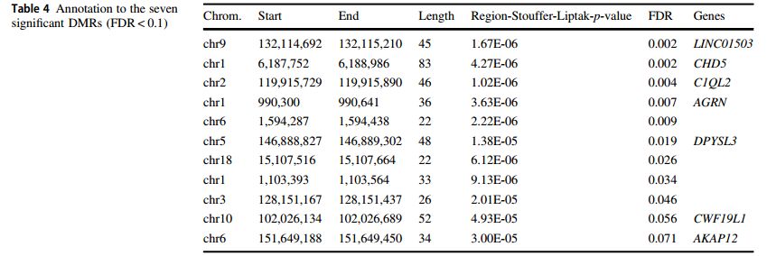 采用comb-p矯正p,鑒定出11個(gè)FDR<0.1的DMR,其中9個(gè)FDR<0.05,位于染色體1、2、3、5、6、9、10和18 。4個(gè)有意義的 DMRs (從chr 1:1103393-1103564,chr 1:990300-990641;chr 6:1594287-1594438;?chr 10:102026134-102026689 )包含了有顯著意義的CpGs 。4個(gè)DMR位于基因間區(qū),其余7個(gè)注釋在9號(hào)染色體LINC01503(RNA基因)、5號(hào)染色體DPYSL3(與非酒精性脂肪肝相關(guān)), 1號(hào)染色體CHD5和AGRN(有研究孕婦體重指數(shù)對(duì)新生兒血液DNA甲基化的影響), 2號(hào)染色體C1QL2, 10號(hào)染色體CWF19L1, 及6號(hào)染色體 AKAP12。圖中展示了11個(gè)DMR的甲基化模式,除了圖f和j的DMR與BMI呈負(fù)相關(guān)外,其余9個(gè)DMR與BMI呈正相關(guān)。采用Danish雙胞胎的基因表達(dá)數(shù)據(jù),檢驗(yàn)了與11個(gè)DMR相關(guān)的7個(gè)基因表達(dá)水平與BMI的相關(guān)性。LINC01503和AKAP12有顯著意義。