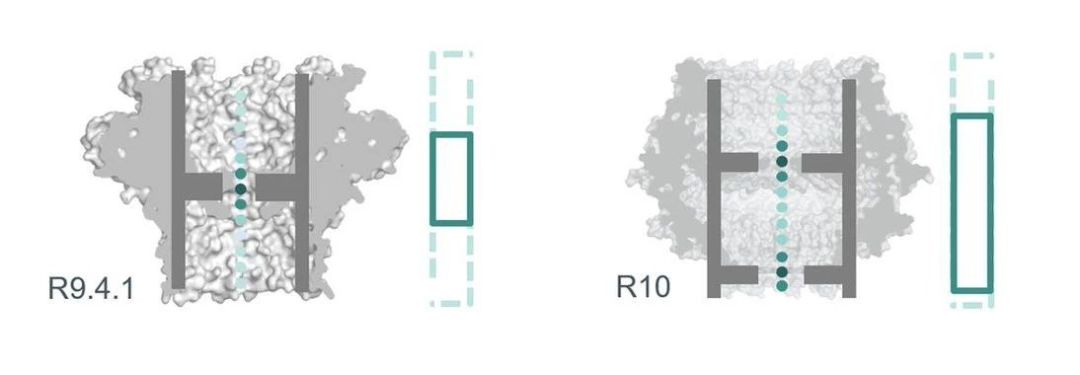 新升級(jí)R10芯片大的更新是納米孔采用了雙讀取器(Reader)的設(shè)計(jì),能夠?qū)ν粔A基進(jìn)行兩次信號(hào)識(shí)別。理論上,同一堿基的識(shí)別次數(shù)為R9.4.1版本芯片2倍,由此來增加堿基的判斷率,減小隨機(jī)錯(cuò)誤,并提高一致準(zhǔn)確性。R10與R9.4.1測序方式比較如圖1