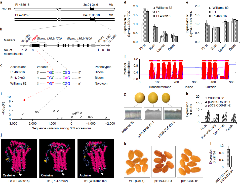 隨后對RIL的兩個子集進行處理,以通過測序(GBS)進行基因分型。基因型和表型數(shù)據(jù)的組合在PI 468916和PI 479752中在13號染色體上種皮開花的基礎(chǔ)上定義了一個區(qū)域(圖2a),該區(qū)域與先前映射的B1區(qū)域重疊,表明這兩個種質(zhì)由B1基因座控制。在映射區(qū)域內(nèi)的其他標記用于鑒定兩個RIL群體中與B1基因座之間的重組體,最后根據(jù)大豆參考基因組序列將B1基因座精細映射到一個包含兩個基因(Glyma.13G241700、Glyma.13G241800)的14.5 kb區(qū)域(圖2b)。對三個親本系的兩個基因進行測序,Williams 82和兩個大豆親本之間的差異只有一個SNP位點,即Glyma13G241700的編碼序列(CDS)中的一個(C到T)點突變,導(dǎo)致氨基酸從半胱氨酸變?yōu)榫彼幔▓D2c)?;ê?周,Glyma.13G241700在發(fā)育中的豆莢中最高表達,其在PI 468916和(Williams 82×PI 468916)F1中的表達水平相似,但均明顯高于Williams 82(圖2d)。相比之下,兩個親本中的Glyma.13G241800和F1的表達水平?jīng)]有顯著差異(圖2e)。這些觀察結(jié)果表明,雙親中的Glyma.13G241700最有可能成為B1的候選基因,預(yù)計B1編碼跨膜轉(zhuǎn)運蛋白樣蛋白(圖2f)。