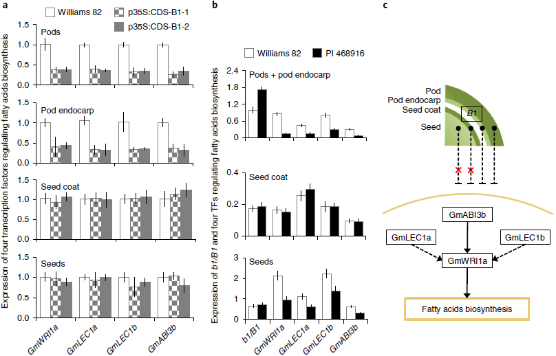 為了闡明B1介導(dǎo)降低種子油含量的機制,分析了Williams 82發(fā)育豆莢、豆莢內(nèi)果皮、種皮和種子中四種轉(zhuǎn)錄因子GmWRI1a,GmLEC1a,GmLEC1b和GmABI3b的表達水平。B1和PI 468916的T1轉(zhuǎn)基因植物在R5階段過表達。這些轉(zhuǎn)錄因子上調(diào)了大豆種子中脂肪酸的生物合成,其表達水平與種子油含量呈正相關(guān)。在B1的過表達下發(fā)育中的豆莢和豆莢果皮中四種轉(zhuǎn)錄因子的表達水平均顯著降低而在發(fā)育中的種皮和種子中未觀察(圖4a)。Williams 82和PI 468916之間的B1 / b1表達模式與之呼應(yīng)(圖4b)。表明B1基因不影響大豆種子中脂肪酸的合成,是通過下調(diào)脂肪酸生物合成影響莢果(圖4c)。