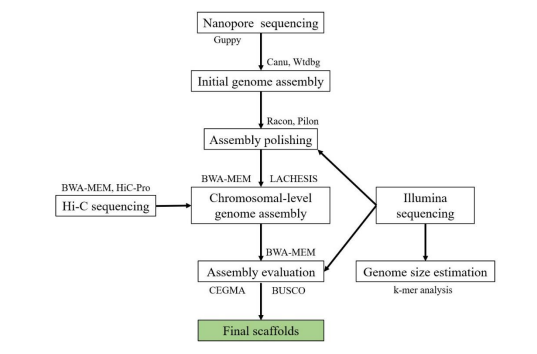 占比地球容量71%的海洋中蘊(yùn)藏著豐富的生物資源,而海洋生物體內(nèi)多糖和蛋白含量較高,以及部分海洋生物極易死亡腐敗從而引起DNA的降解,給高純度、完整的基因組DNA的獲取帶來了極大的困難。而海洋生物通常與陸生動(dòng)植物相比更為復(fù)雜,組裝拼接的難度更大。本次研究使用Nanopore測序技術(shù)突破了這些瓶頸,完成了海洋魚類超高質(zhì)量的基因組組裝!研究中使用104X Nanopore測序數(shù)據(jù)進(jìn)行基因組組裝,通過Canu、WTDBG等多款軟件分別進(jìn)行組裝,選取組裝結(jié)果(主要從基因組大小,contig N50,組裝完整性,組裝準(zhǔn)確性等方面評(píng)估)進(jìn)行后續(xù)研究優(yōu)化。研究者最終使用WTDBG軟件組的基因組版本結(jié)合Hi-C技術(shù)的進(jìn)一步優(yōu)化,組裝完成474.31 Mb基因組,并將99.44%的基因組掛載至20條染色體上,?ContigN50提升至22.46 Mb,且最長的Contig達(dá)到32.32 Mb!