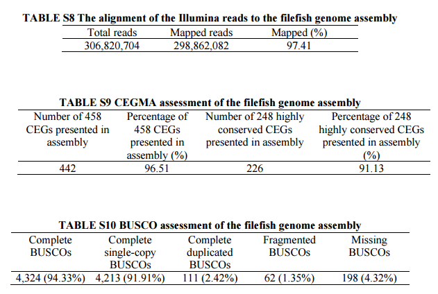 眾所周知,Contig N50是衡量基因組組裝質(zhì)量好壞的一個(gè)重要指標(biāo),一定程度上來說,ContigN50值越高表示組裝的質(zhì)量越好。與已有鲀形目基因組比較,綠鰭馬面鲀基因組組裝的ContigN50超過了同樣使用三代測序進(jìn)行組裝的黃鰭東方鲀(Takifugu flavidus)的5倍,更是超過了翻車魚(Mola mola)的1000倍!