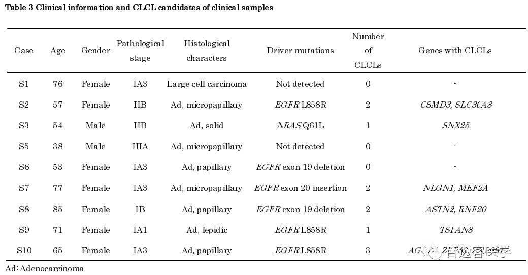為了檢查臨床肺癌肺腺癌病例中是否也存在CLCL,對(duì)9名日本肺腺癌患者的手術(shù)標(biāo)本進(jìn)行了類似的PromethION全基因組測序(表3)。表3中顯示了每個(gè)患者所檢測到的驅(qū)動(dòng)基因突變。平均每個(gè)case生成了43,953,136,203 bp的序列(深度大于10倍)。對(duì)于S10病例,還對(duì)正常組織標(biāo)本進(jìn)行了測序,以消除可能的正常組織變異和源自比對(duì)錯(cuò)誤的可疑CLCL。