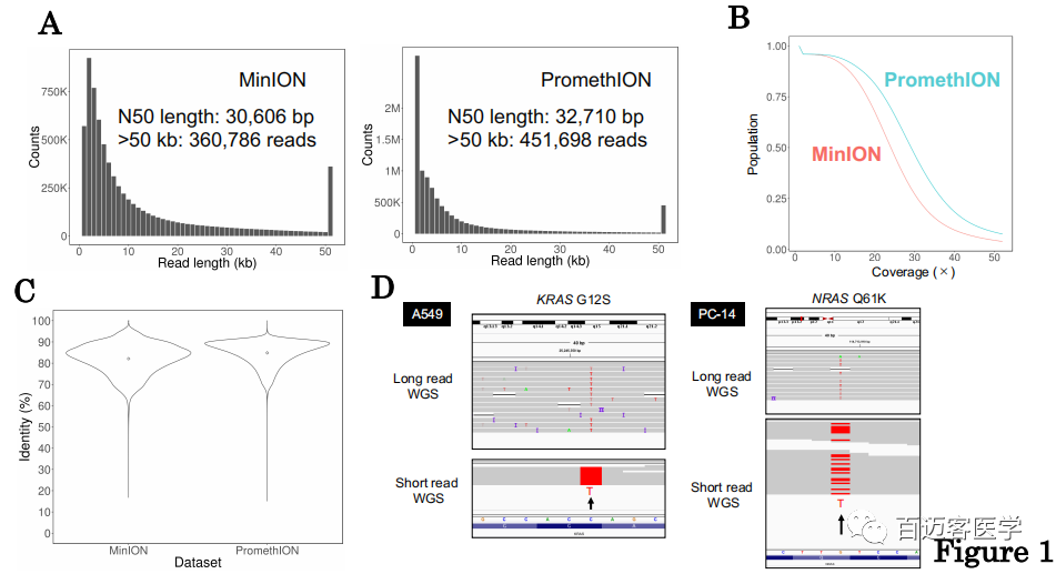 PromethION vs MinION:為了探究PromethION測序是否與MinION測序兼容,比較了獲得的兩個(gè)數(shù)據(jù)集的特征。Reads長度的總體分布是相似的(圖1A)。這兩個(gè)數(shù)據(jù)集都包含很大一部分超過50 kb的長讀長reads(MinION:360,786個(gè)讀,PromethION:451,698個(gè)),20X以上測序深度覆蓋了超過50%的人類基因組區(qū)域(圖1B),兩個(gè)數(shù)據(jù)集均顯示了超過80%的整體保真度(圖1C),與先前的研究相似。PromethION平臺(tái)各項(xiàng)指標(biāo)稍微好一點(diǎn)。結(jié)論:PromethION是用于整個(gè)癌癥基因組測序的有效分析方法。
