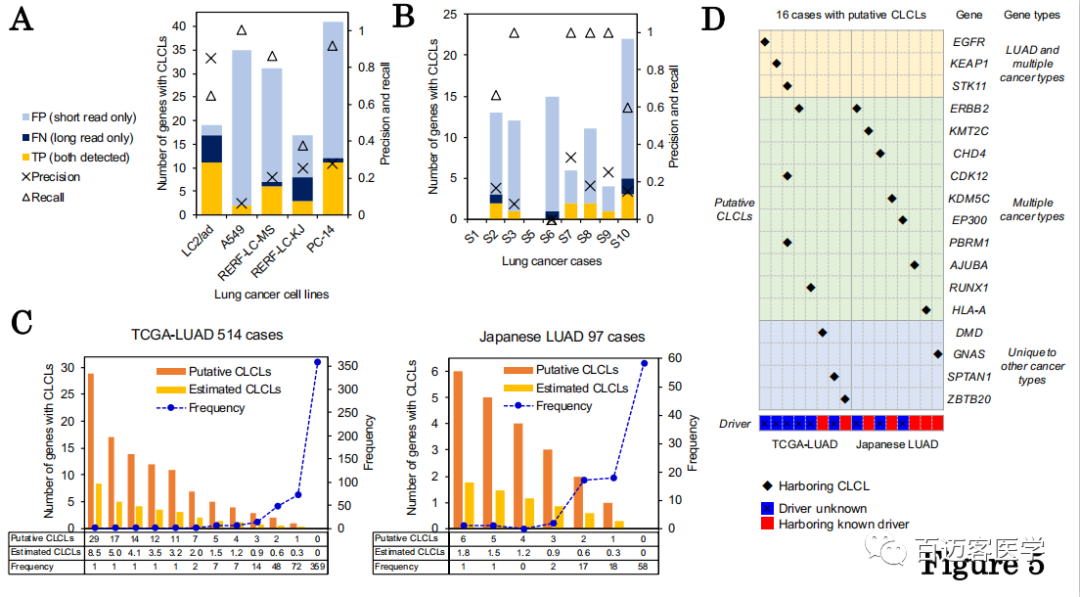 之后收集并分析了9個(gè)臨床病例約63X測序深度的全基因組短讀長測序數(shù)據(jù),分析可能的CLCL,確定了可能受推定的CLCLs影響的9個(gè)基因。如圖5B所示,從短讀長數(shù)據(jù)開始檢測到CLCL,估計(jì)靈敏度為73%。但是,由于較短的讀長reads所固有的各種原因,z確率被限制為14%。